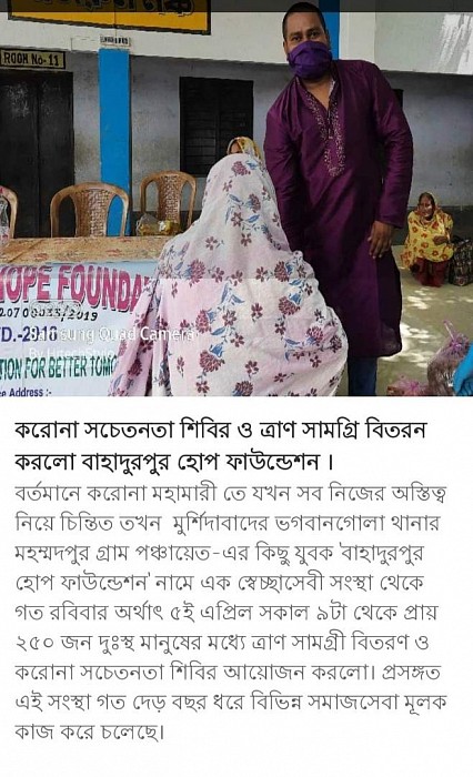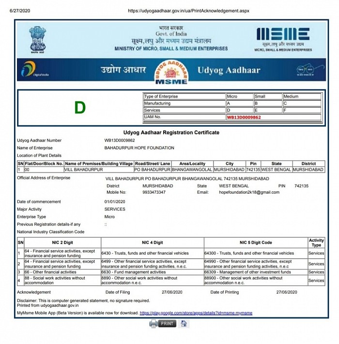 HOPE (Helping Out People Everyday) Foundation. (Non-profit organization). Registered under Indian Trusts Act 1882, vide no. iv-120700033/2019.